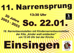 Vor dem Narrensprung findet um 12.45 Uhr das 18. Narrenbaumstellen bei der Kirche statt. Der Narrenbaum, verziert mit Schildern der acht Figuren der ausrichteten Narrenzunft, sieht wie ein überdimensionaler Torfstecher aus, der umgedreht im Boden steckt. Die Hästräger von unserem befreundeten Zünfte stellen mit sogenannten Schwalben den Narrenbaum auf. Die Kinder der städtischen Kindertagesstätte "kinder welt entdecker" Einsingen werden zum achten Mal einen Kindernarrenbaum mit viel Freude schmücken und gestalten, welcher neben dem Narrenbaum aufgestellt wird. Es werden wieder Süßigkeiten, Spielsachen und viele schöne Basteleien an dem Kindernarrenbaum zu finden sein.