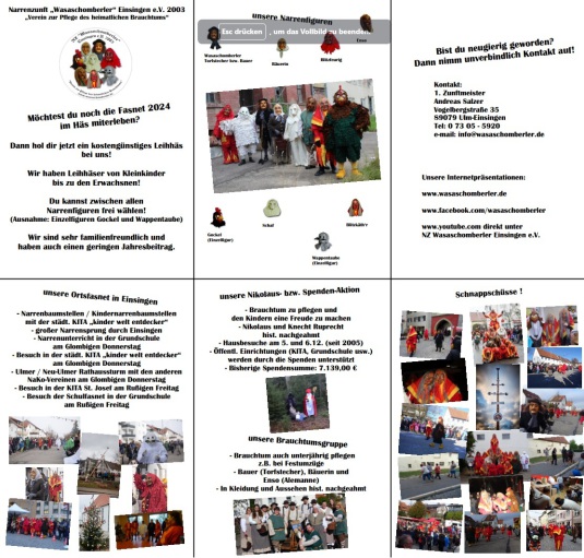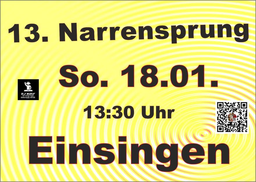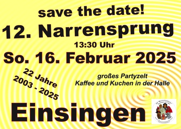 Angeführt wird der Narrensprung von uns mit unserem Narrenruf Wasa - Schomberler, gefolgt vom Musikverein Einsingen, vom KITA's - Kath. „St. Josef“ und der städtischen Kindertagesstätte "kinder welt entdecker“, zum ersten Mal dabei ist der Waldkita "Igelkinder", es folgenden Gruppierungen aus Einsingen sowie viele Narrenzünfte und Musiker aus Nah und Fern.