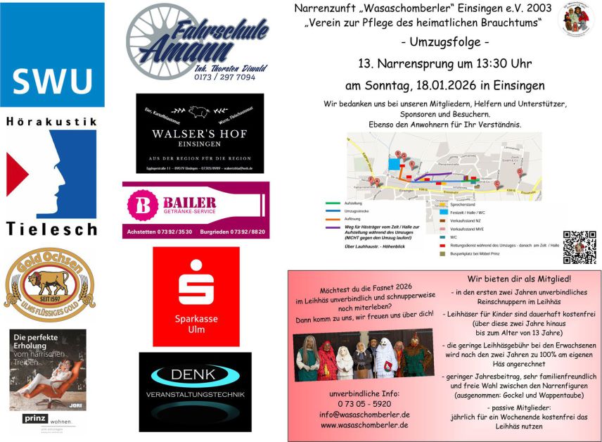 Es werden rund 3.000 Teilnehmern am Sonntag, 18.01.2026 um 13:30 Uhr durch Einsingen ziehen.